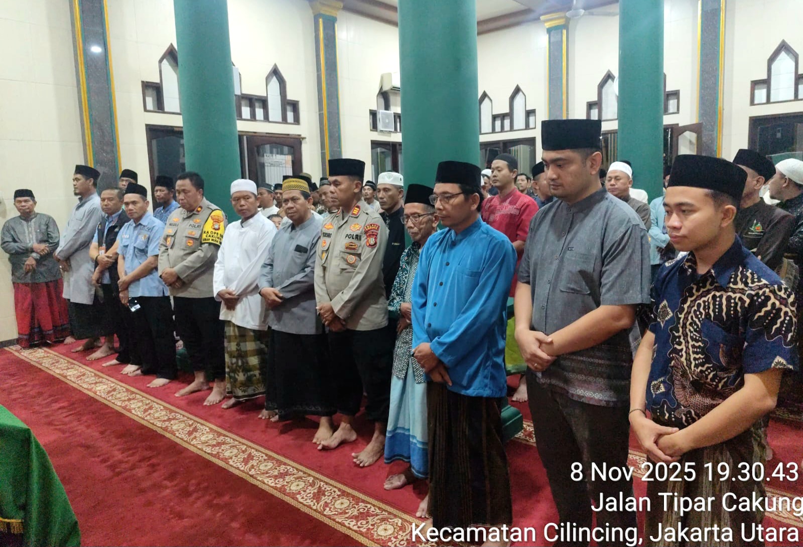 Sebagai bentuk penghormatan dan wujud duka mendalam atas gugurnya salah satu Penjaga Jakarta, Kapolsek Cakung Kompol Widodo Saputro, S.H., M.H. bersama Wakapolsek AKP Sutrisno menghadiri kegiatan sholat jenazah dan prosesi pemakaman almarhum Atim Suhara pada Sabtu (7 November 2025) malam.