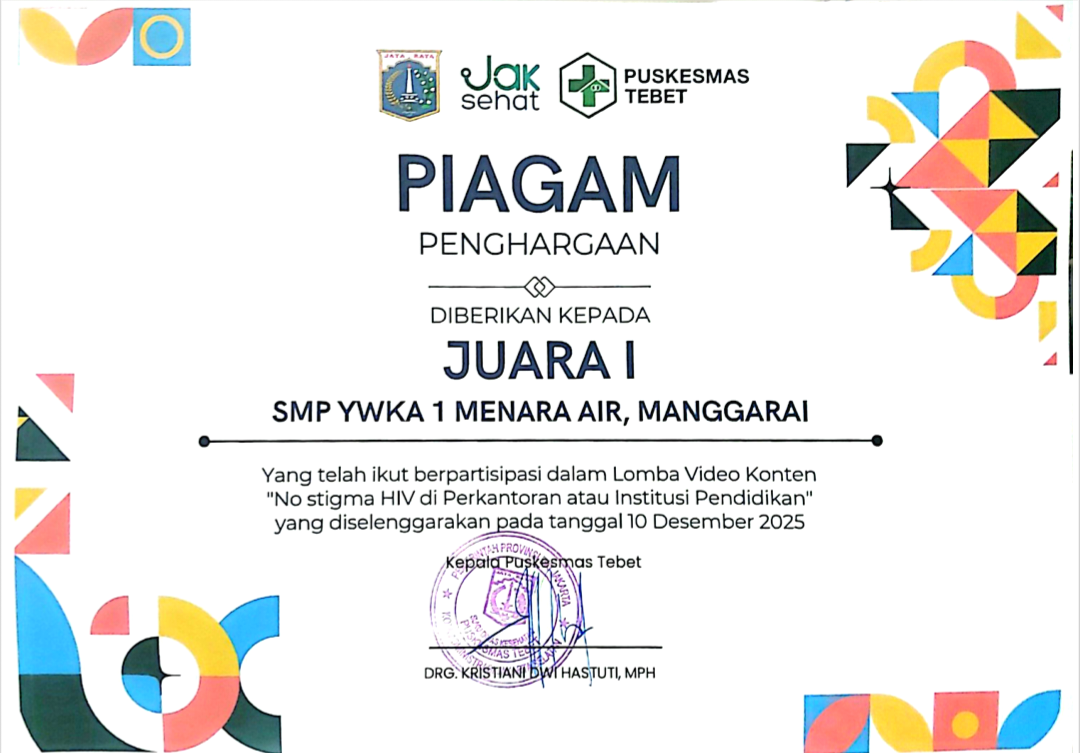SMP YWKA I berhasil meraih penghargaan menjadi juara I lomba konten kreatif 2025 memperingari hari AIDS sedunia dengan tema” No Stigma HIV ” tingkat institusi pendidikan pada 10 Desember 2025 lalu yang di prakarsai Puskesmas Kecamatan Tebet.
